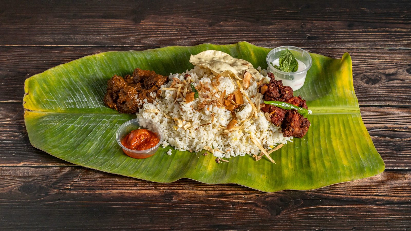 SOUTH INDIAN FESTIVE MEAL WITH NEYCHORU RICE AND ASSORTED SIDES.