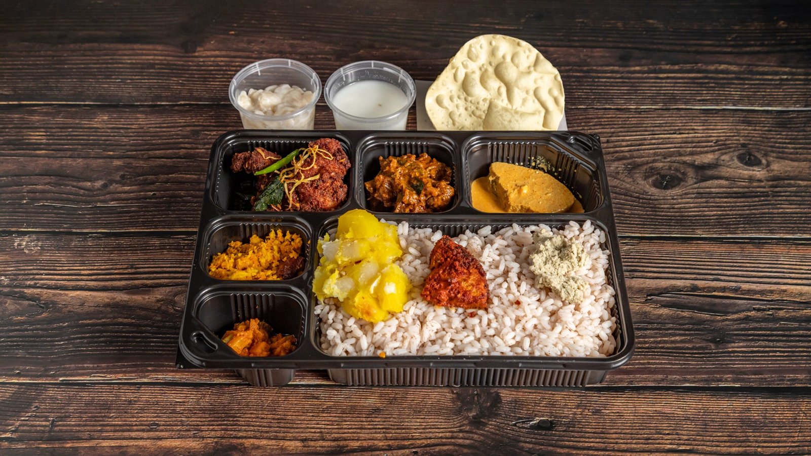 A COMFORTING SOUTH INDIAN MEAL WITH KERALA RICE, CURRIES, AND SIDES.